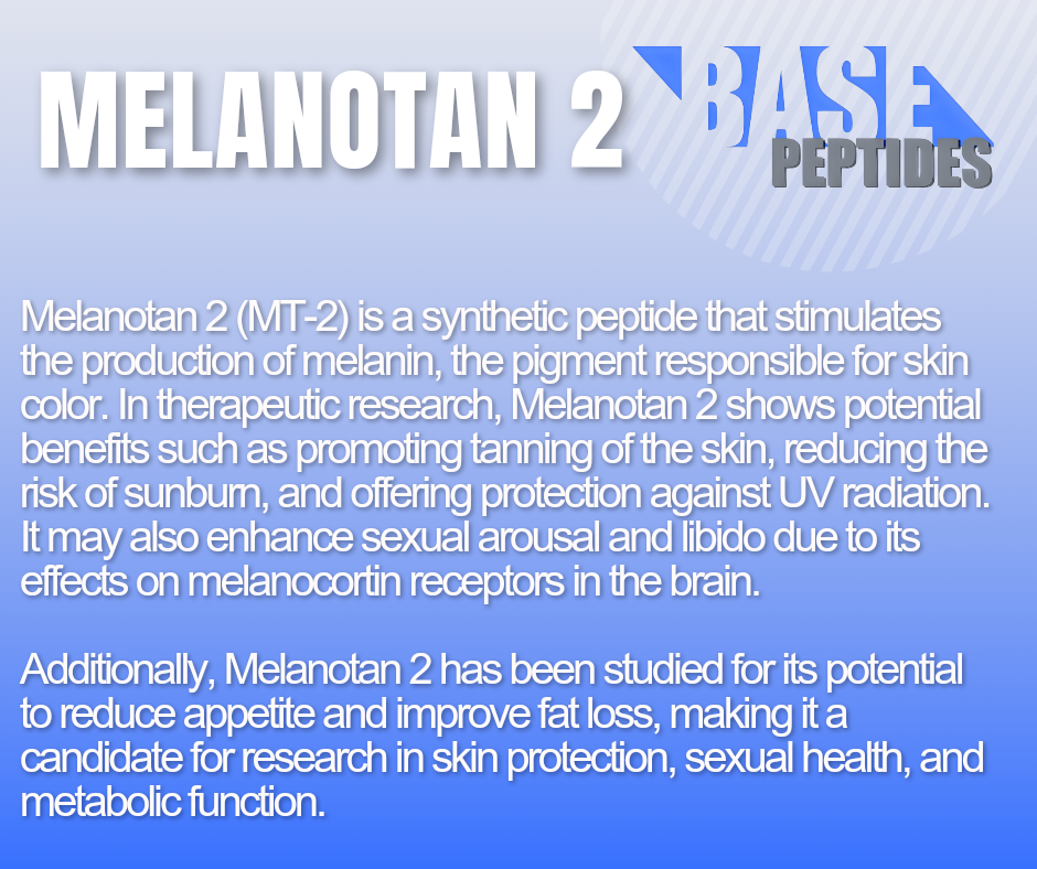 Melanotan 2 is a synthetic analog of α-MSH (alpha-melanocyte-stimulating hormone) that binds to melanocortin receptors, particularly MC1R and MC4R. It is extensively studied for its ability to stimulate melanin production, resulting in skin darkening without prolonged UV exposure. Additionally, MT-2 has shown effects on libido enhancement, appetite suppression, and energy balance, making it a popular subject in cosmetic, metabolic, and sexual health research.